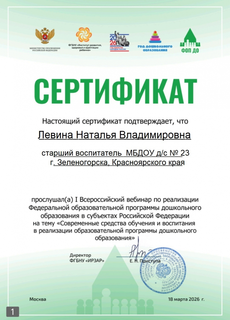 - слушатель I Всероссийского вебинара по реализации ФОП ДО в субъектах РФ на тему: «Современные средства обучения и воспитания в реализации образовательных программ дошкольного образования" - 2026 г.
