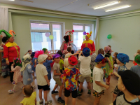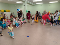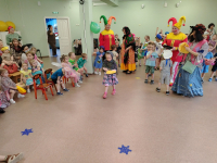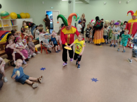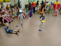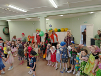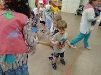 Началось развлечение с того, что в спортинвом зале собрались дети всех групп, а там их уже ждали весёлые скоморохи. Сначала они потанцевали с детьми, потом провели скачки на лошадках. А потом к нам пришла настоящая Баба Яга, уж она то повеселилась и в игру "Ай, блины" с детьми поиграла, и эстафету "Блины в сковороде провела", и канат то дети поперетягивали. А потом сказала, что теперь она, Баба Яга - Масленцей будет. Но ребята ей не поверили, вывели её на чистую воду.