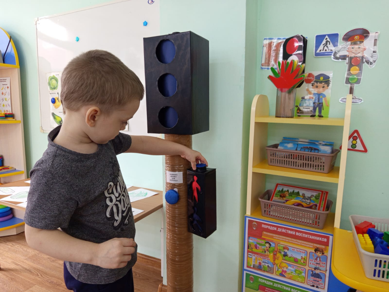 Рассматривание макета светофора в группе (для транспорта и пешеходов)