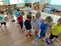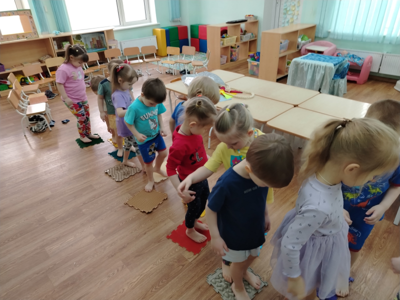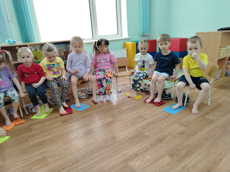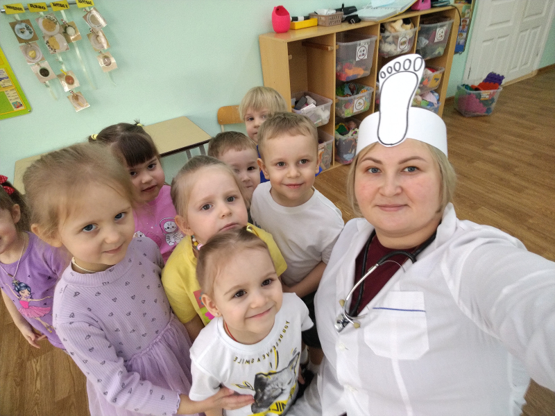 В рамках реализации проекта, был запланирован цик познавательных занятий. Одно из них - это "Встреча с доктором Пяточкиной". Доктор пришла в группу, узнала у ребят, что они знают о своих стопах, о том как и зачем нужно о них заботиться. А также поделилась с ребятами новыми упражнениями для поддержания их стоп в здоровм состоянии.
